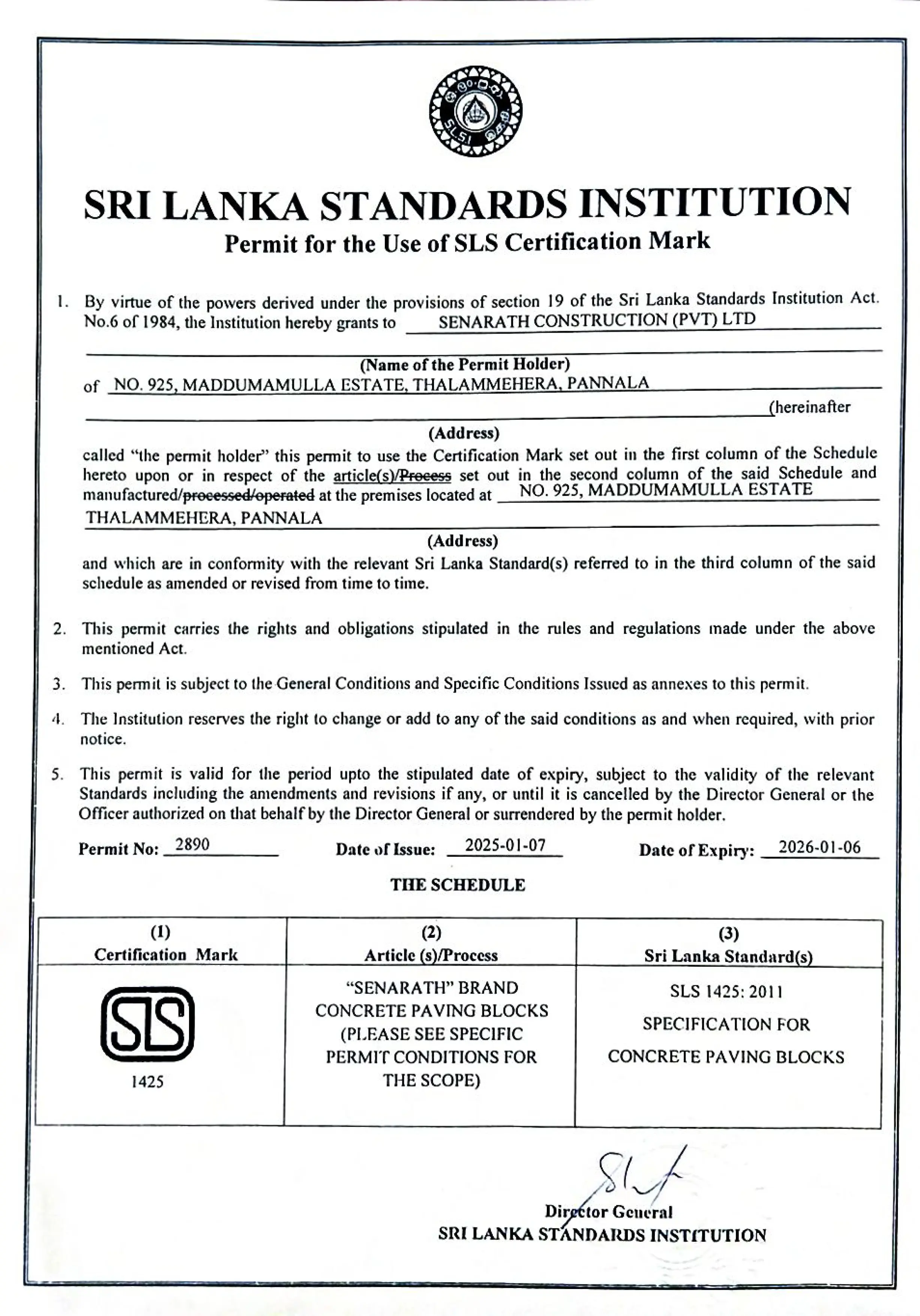 Senarath paving is accredited with the Sri Lanka Standards Institution (SLS) Certification for our “Senarath” brand concrete paving blocks, under SLS 1425:2011. This certification ensures that our paving blocks are manufactured to meet the highest national standards of durability, strength, and performance. The SLS mark is a trusted symbol of quality in Sri Lanka, giving our clients confidence that every paving block we produce is reliable, safe, and built to last. With this recognition, we continue to reinforce our reputation for excellence in delivering sustainable and high-quality construction materials for infrastructure and development projects.